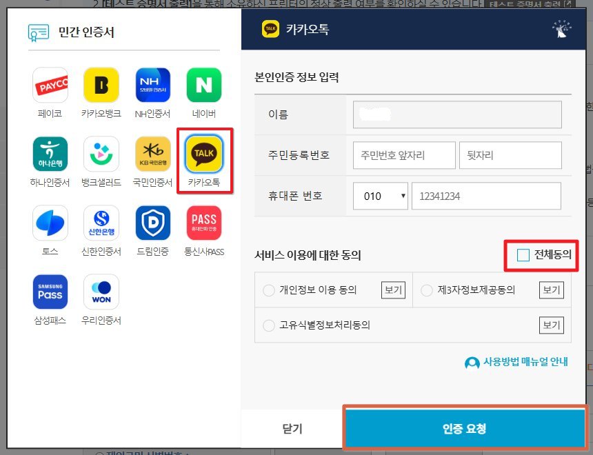 저는 카카오톡 인증으로 진행하였습니다. 다른 인증서도 비슷하니 똑같이 따라 하시면 됩니다.