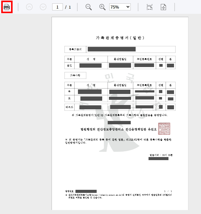 이 방법을 통해 프린트한 가족관계증명서는 대부분의 경우 유효하며, 인쇄 후 사용 가능합니다. 다만, 일부 기관에서는 원본 서류나 공증된 서류를 요구할 수 있으므로, 이를 제출하는 곳에서 요구하는 서류 형식을 확인하는 것이 좋습니다.