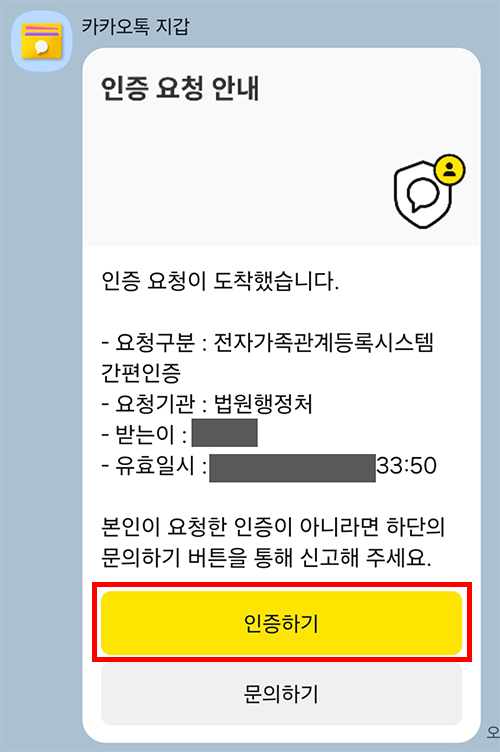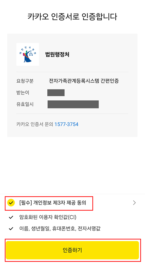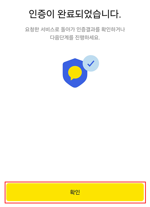 모바일 카카오톡 앱으로 알림톡이 오면 필수 체크하고 인증하기 > 인증하기 > 확인 클릭하면 간단히 완료 됩니다.