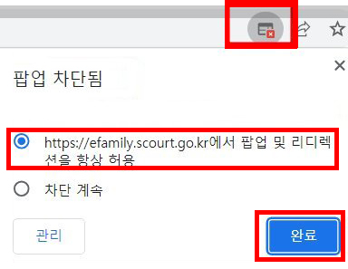 - 브라우저에 팝업이 차단 되어 있을경우 "팝업 및 리디렉션을 항상허용"을 선택하고 완료 버튼을 클릭합니다.