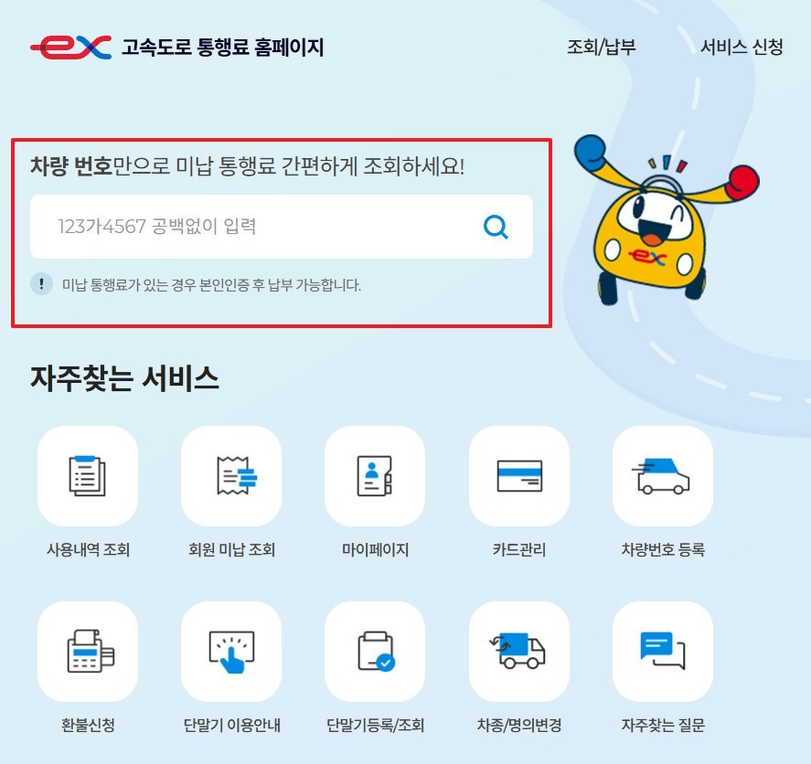 | 고속도로 통행료 홈페이지 | 차량번호만으로 미납 통행료 간편 조회 |